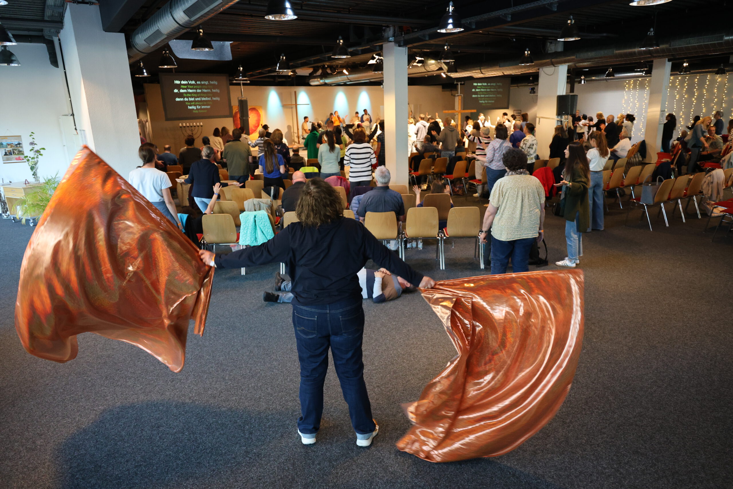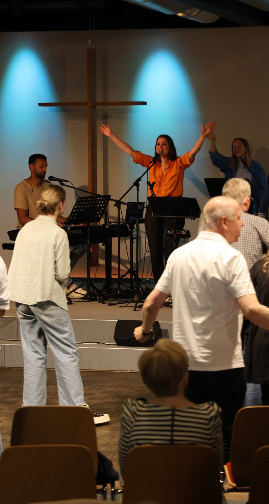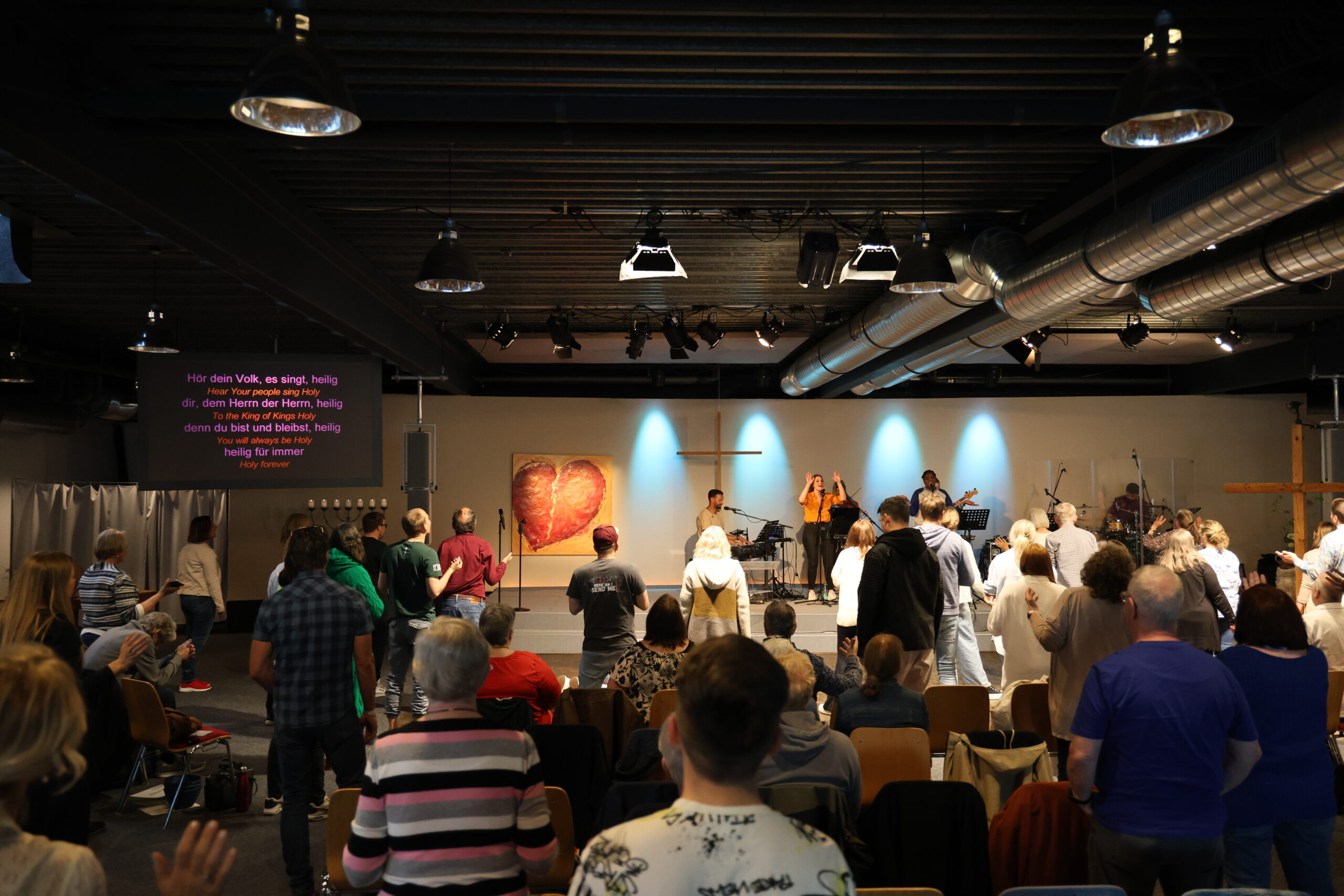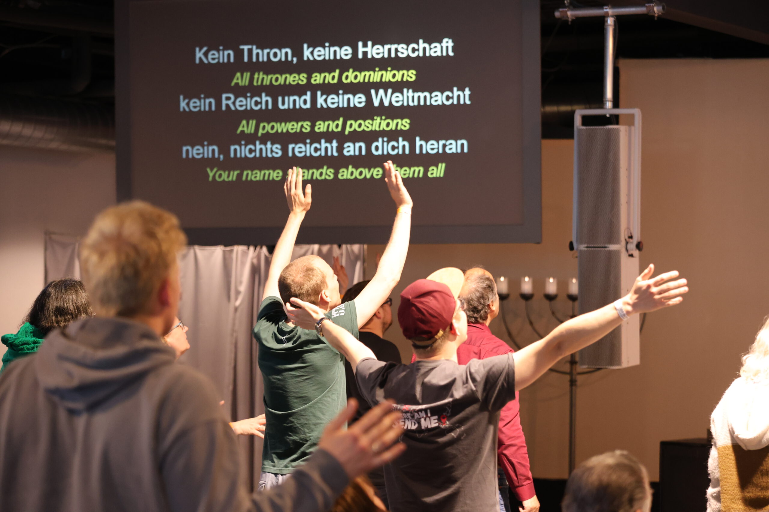 Wir haben eine Zeit des Lobpreises in jedem Gottesdienst. Liedtexte werden an die Screens geworfen, damit du mitsingen kannst!